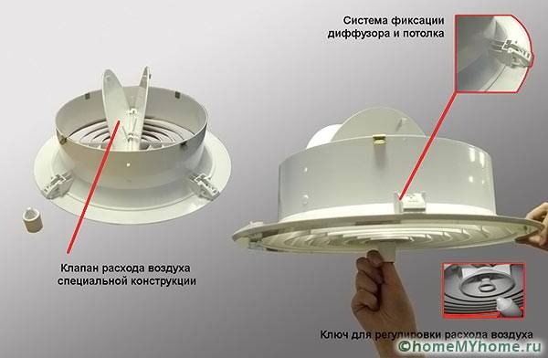 Все диффузоры для вентиляции фото которых выложены в интернет-магазинах, устанавливают в специально подготовленные места, соответствующие им по размеру и форме. Специальные защелки на корпусе этих устройств обеспечивают их фиксацию. Эти устройства устанавливают как совместно с гибкими воздуховодами (рукавами), так и в жестяные каналы.