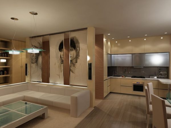 Важно: такие раздвижные перегородки особенно хороши, если на кухне нет вытяжки — запахи с кухни будут меньше проникать в гостиную зону.