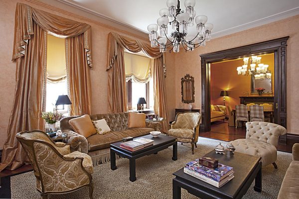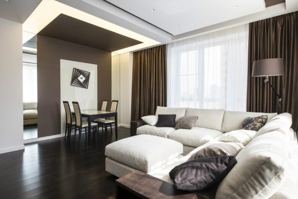 Темный цвет в интерьере гостиной практически всегда будет обладать естественной доминантой. Поэтому сочетание темно-коричневых штор с интерьером следует использовать через более светлые тона и подводить его плавными переходами к остальным цветам интерьера гостиной.