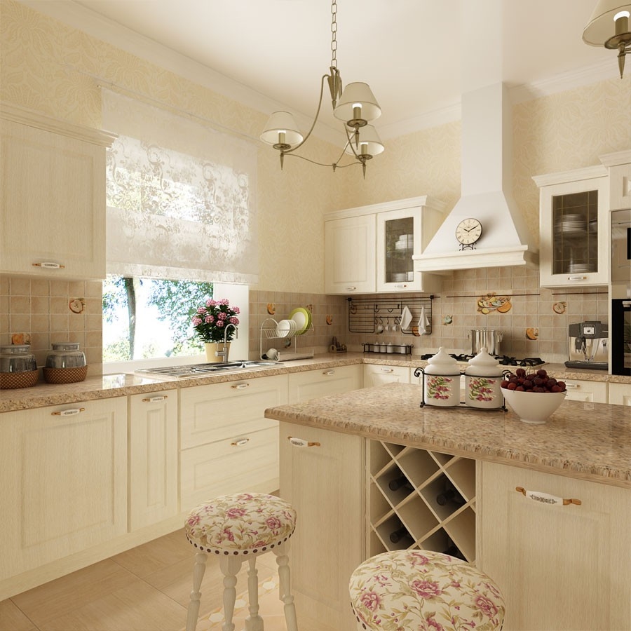 Этот французский деревенский стиль отличается простором и одновременно уютом. Кухонная стенка выбирается в светлых пастельных оттенках, со стеклянными подвесными шкафчиками и искусственно состаренной поверхностью. Аналогично должен выглядеть и стол. Вся корпусная мебель изготавливается из натуральной древесины.