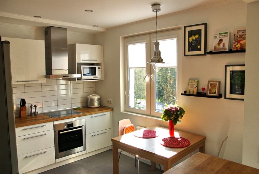 Минимализм – идеален для коротких квадратных кухонь. Предполагает наличие минимального количества мебели, только самое необходимое. Мебель подбирается лёгкая, компактная, функциональная, строгой формы.