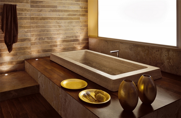 Столешница в ванну из камня выглядит дорого, она придает интерьеру комнаты особый шик. Натуральный камень гармонично сочетается с другими материалами: стеклом, керамикой, мозаикой, хромированной сантехникой. Мраморные столешницы в ванной отличаются высокой прочностью и долговечностью. Единственным недостатком этого материала можно назвать его высокую стоимость.