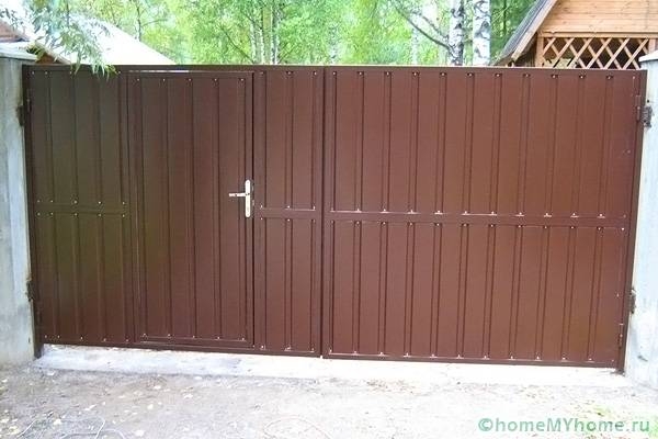 Как правило, подобную конструкцию изготавливаются высотой в 5-6 метров, чтобы обеспечить безопасность частного сектора от проникновения преступников. В конструкции часто предусматривается калитка, которая позволит войти во двор, не открывая створку целиком.